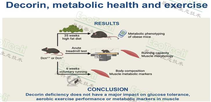 实验测试结果表明,缺乏decorin不影响该小鼠肥胖或葡萄糖耐受不良的发展,对骨骼肌纤维大小或与代谢、肌发生或ECM形成相关的基因的表达没有重大影响。