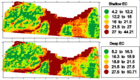 4 局部的降雨差异一般不至于导致土壤含水量差异大到足够引起电导的差异,因为土壤电导测量技术测量的是0-3英尺(90cm)整个剖面的EC,受表面土壤水的影响较小。