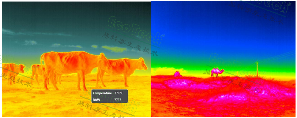 左图:蒙古牛红外热成像图;右图:沙漠骆驼红外热成像图