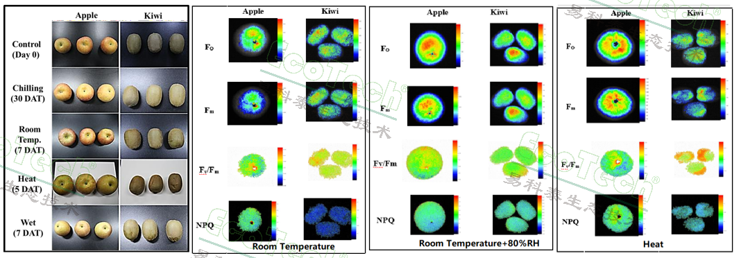 利用FluorCam评估室温、高温、高湿等不同储存条件下保存的苹果和猕猴桃的新鲜品质。研究表明,在热胁迫下,苹果和猕猴桃Fv / Fm、ΦPSII和NPQ的变化均高于其他胁迫下的变化。低温(4°C)下其光合状态则保持相对稳定,此条件下保存的果实新鲜品质较高。