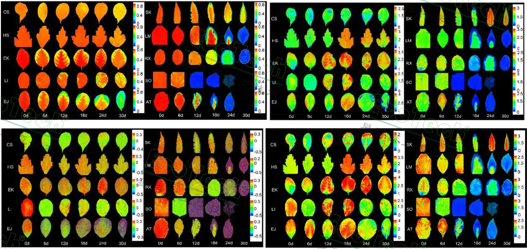 研究中选取了贴梗海棠(CS)、木槿(HS)、胶东卫矛(EK)、南阳杜鹃(LI)、日本卫矛(EJ)、珍珠梅(SK)、金银忍冬(LM)、黄刺玫(RX)、紫丁香(SO)、榆叶梅(AT)等十种灌木,通过30天的淹水处理,结合叶绿素仪与FluorCam荧光成像系统,无损监测了叶片叶绿素含量与多项荧光参数的变化。结果显示: