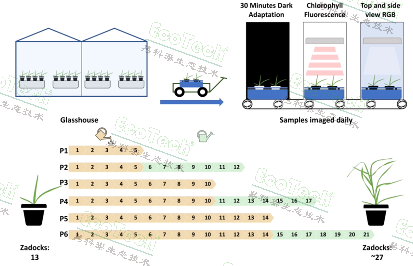 在三叶期(即Zadoks 13)对大麦施加水淹胁迫,通过将花盆置于一个密封排水孔的外盆中,使水位保持在土壤表面以上约1厘米处,对应于大约120%的田间持水量。对照组的花盆排水孔未密封,保持在大约60%的田间持水量。在实验2中,水位保持在大约140%的田间持水量,对照组保持在大约100%的田间持水量。不同水分处理通过PlantScreen™高精度自动灌溉系统每日08:30监测并调控,系统以目标重量为基准实现定量补水。