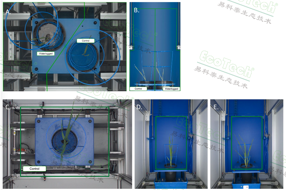 A、B为都柏林大学实验1的俯视与侧视示意图,胁迫第4天使用PlantScreen™系统采集的 RGT Planet品种的图像;绿色线标示单株分割区域,图中蓝色支架用于防止叶片越界。C、D、E为亚眠大学实验2 的俯视与 0°、90°双侧视配置,绿色线对应RGB成像室单次拍摄的分割边界,示例为第14天对照植株。每次灌溉与拍摄后,所有培养盆均返回生长室内预设固定位置。