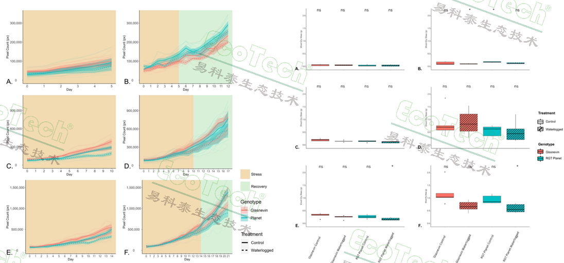 图3(左) 实验1中Glasnevin no.5与RGT Planet两品种在水淹与对照条件下的地上部投影面积PSA(n = 5)。橙色区段为胁迫持续期,绿色区段为恢复期;PSA为侧视与俯视分割像素之和。A–F分别对应处理P1–P6。
