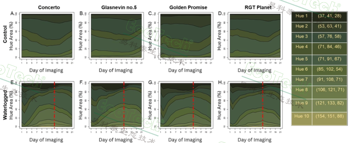 通过对图像中的绿色度进行分析,发现水淹胁迫导致某些特定色调的像素数量发生变化。具体来说,较深的绿色调(Hue 2、3和4)在水淹植物中变得不那么明显,而较浅的绿色调(Hue 7、8、9和10)以及最深的色调(Hue 1)在水淹胁迫下有所增加。这些变化在胁迫期间最为显著,并在恢复期逐渐恢复正常(图5)。因此,不同基因型大麦在水淹胁迫下叶片绿色色调的组成和动态变化存在显著差异,可作为快速、无损的耐淹性诊断指标。