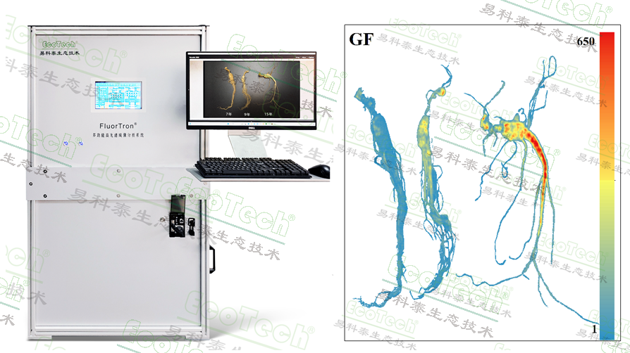 左图为FluorTron®多功能高光谱成像系统;右图为人参的绿色荧光图(左:7年;中:9年;右:15年)
