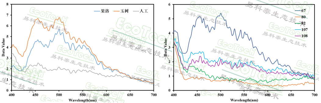 冬虫夏草因其珍贵的药用价值备受青睐,但也成为造假重灾区。易科泰EcoTech®实验室与山东农业大学合作,利用FluorTron®系统对不同来源的虫草进行了无损检测。研究涵盖果洛、玉树产地的野生资源、市场高低品质野生虫草及人工培植虫草。结果表明,野生虫草在460nm和503nm处呈现两个特征荧光峰,荧光强度显著高于人工培植虫草;而高品质野生虫草(67号)的荧光强度又明显高于低品质野生虫草(80、82号)。荧光光谱如同一枚“指纹”,让虫草的产地与品质无处遁形。