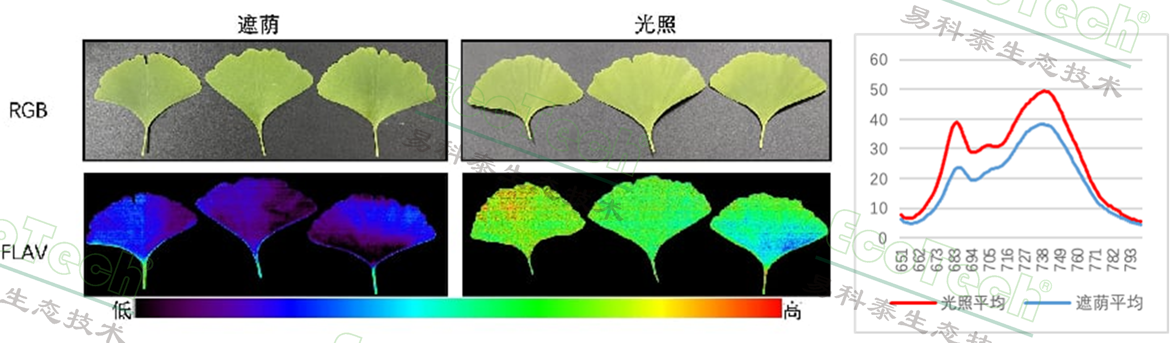 黄酮醇是银杏叶的主要活性成分,具有抗氧化、清除自由基等作用。利用FluorTron多功能高光谱成像的黄酮醇测量程序,获得阳光照射条件好的银杏叶(光照组)和常年处于阴影状态下的银杏叶(遮荫组)的生物荧光高光谱信息,并计算FLAV=log(FRF_R/FRF_UV),该指数可以反映叶片表皮黄酮醇含量。实验结果表明,光照条件下银杏叶Flav平均值为1.397,显著大于遮荫条件下的平均值0.861。同时,利用该系统实现活体银杏叶黄酮含量分布的可视化。