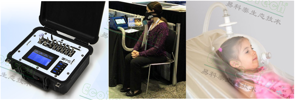 图左为新款FMS便携式主机,图中、右为人体呼吸面罩(或呼吸罩篷)