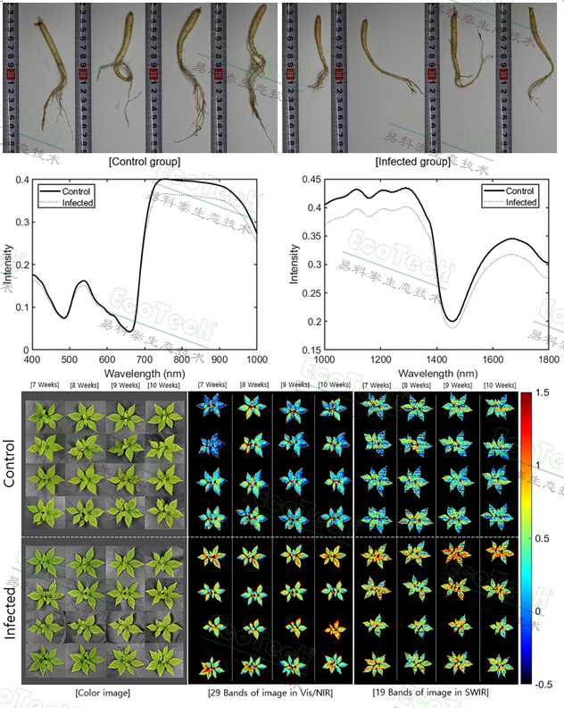 图1 高光谱反射成像用于无损评估高丽参根腐病:从上到下为对照组与根腐病感染组的根发育对比图;两组在可见-近红外和短波红外的平均光谱图;两组的彩色图像和多光谱图像(Vis/NIR和SWIR区域中主要波段的差异)