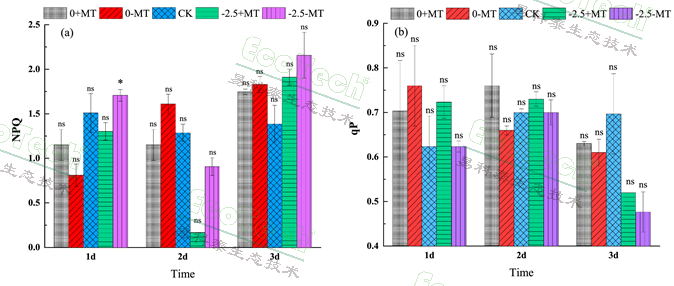 叶绿素荧光成像技术为冷冻胁迫下人参损伤评估、褪黑素缓解效果验证及抗逆机制研究提供了直观数据依据。借助叶绿素荧光成像系统监测发现,Fv/Fm 比值(反映 PSⅡ 光化学效率)在 - 2.5℃冷冻胁迫后显著降至 0.78 以下,而喷施 100 nmol・L⁻¹ 褪黑素 1 周后,该比值可恢复至 0.8 以上;NPQ(非光化学淬灭,反映光保护能力)在胁迫后未施药组较对照组升高 11.44%,施药组则显著降低,证明褪黑素可减轻光抑制损伤。说明叶绿素荧光成像技术能无损、可视化呈现冷冻胁迫对人参光合系统的影响及缓解效果,动态追踪叶片光合功能恢复过程,为人参抗寒栽培与逆境损伤修复提供精准的表型观测手段。