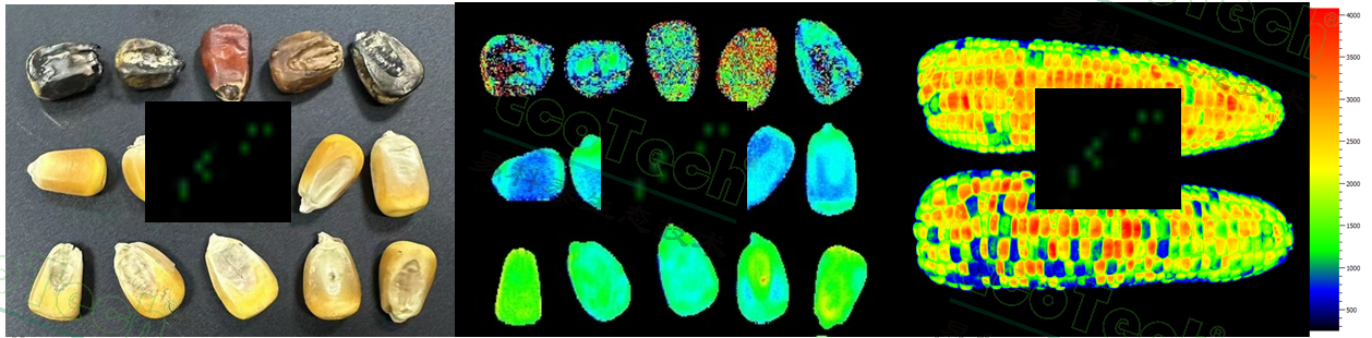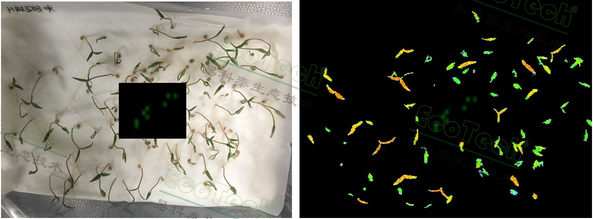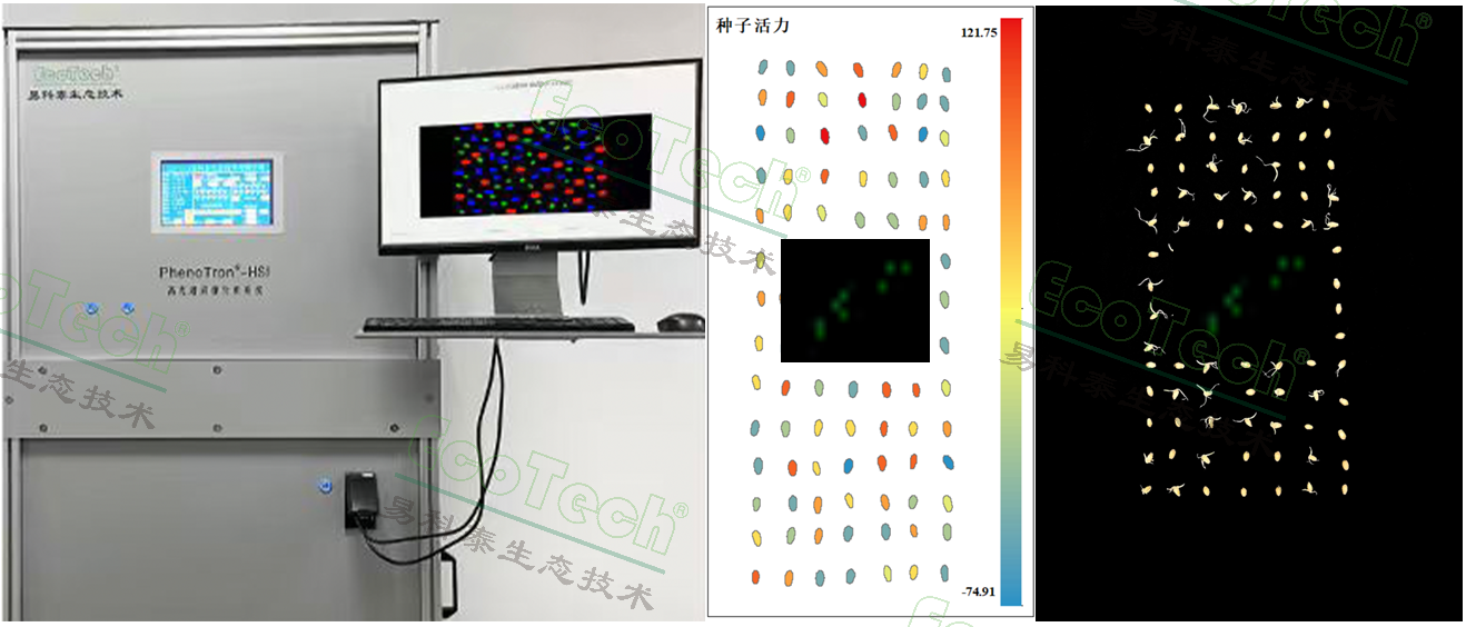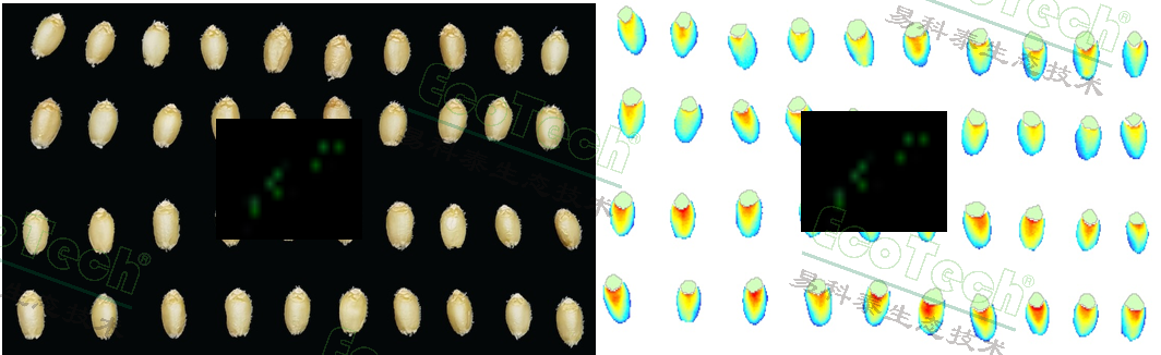 左图:FluorTron®台式多功能高光谱成像分析系统;中图:判断分析算法模型预测小麦种子活力(红色为活力高,蓝色为老化处理失活种子):右图:小麦种子实际萌发情况(EcoTech®实验室供图)