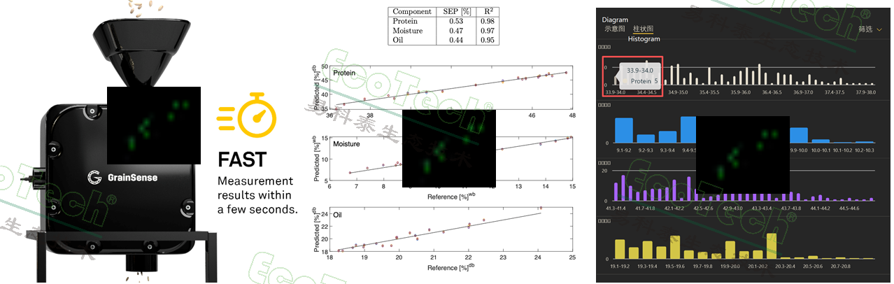 左图:流动式种子成分分析;中图:大豆蛋白质、水分、脂肪含量预测值与真实值对比;右图:实时分析测量并显示频率直方图