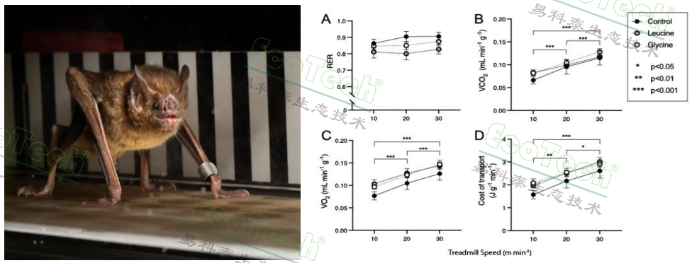多伦多大学生理学家朱莉娅·罗西和加拿大麦克马斯特大学肯尼思·韦尔奇从吸血蝙蝠经常依靠奔跑来追踪和捕获猎物的观察中找到灵感,通过FMS便携式能量代谢测量仪和动物跑步机,以及采用同位素标记的牛血食物来研究24只吸血蝙蝠的新陈代谢机制。通过让蝙蝠以不同的速度(每分钟10、20和 30米)在跑步机上奔跑,同时测量它们的新陈代谢率(耗氧量和二氧化碳产生量等指标,见下图右)。