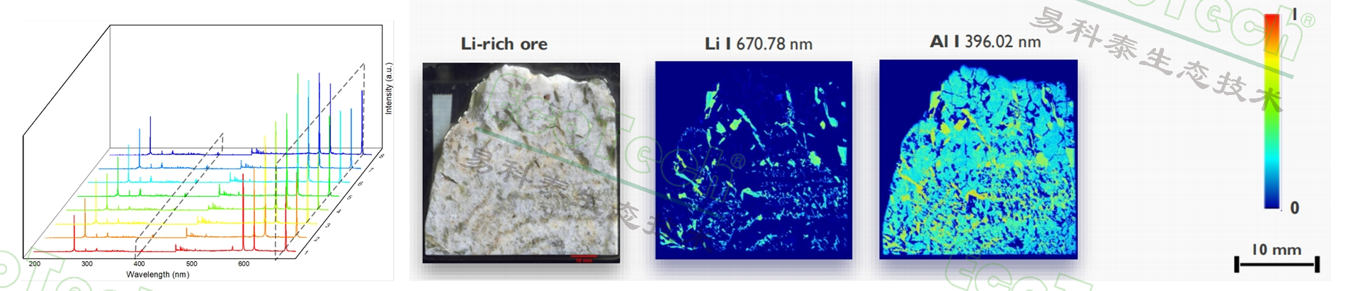 图4. 锂的特征光谱 Li I 610.36 nm 和 Li I 670.78 nm(左图);锂在伟晶岩表面的空间分布(右图)