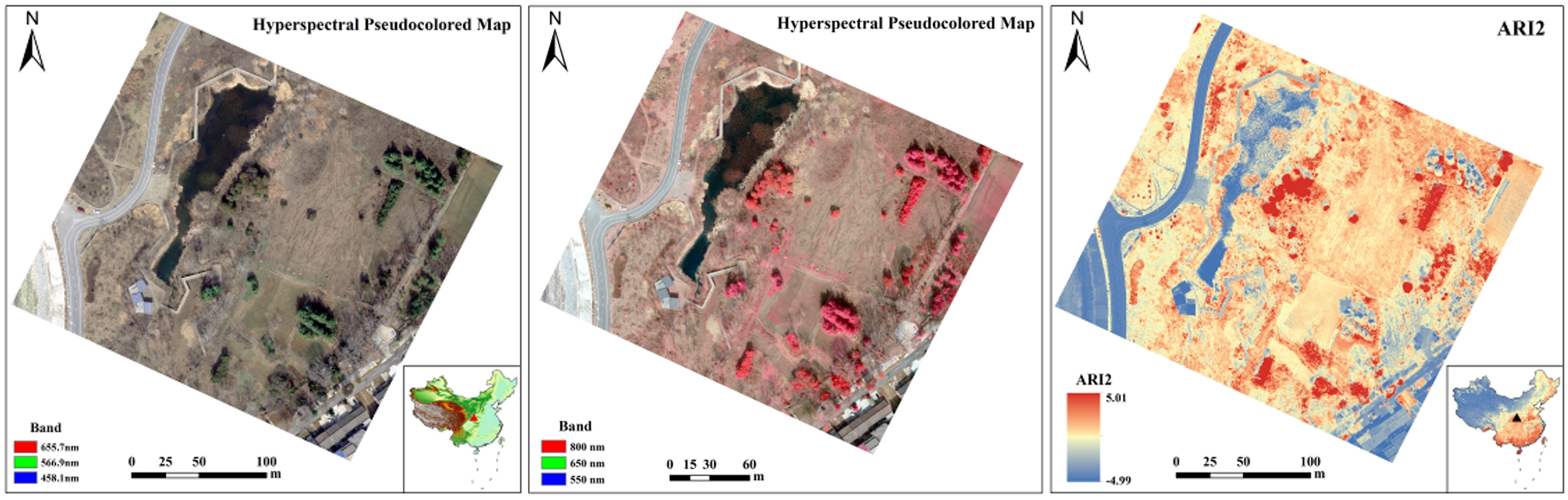 易科泰生态监测技术实验高光谱成果图——真彩色合成、假彩色合成(突出植被信息)及ARI2植被指数