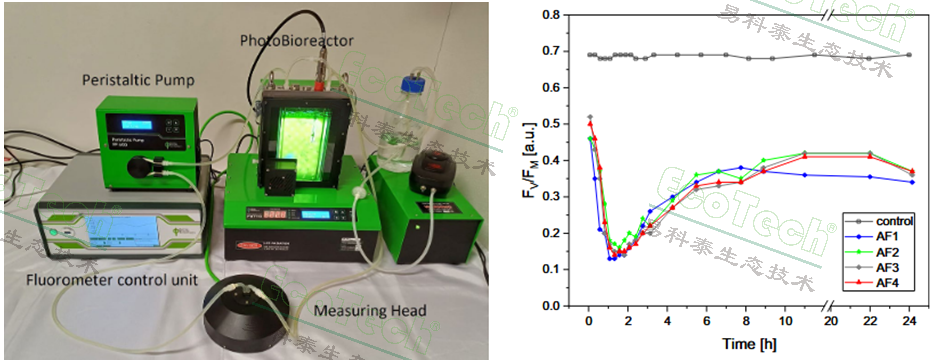 左图为系统配置,包括平板式光养生物反应器与双调制叶绿素荧光测量单元;右图为四个处理组(AF1、AF2、AF3、AF4)和对照组24小时内Fv/Fm(反映PSII光合效率)变化