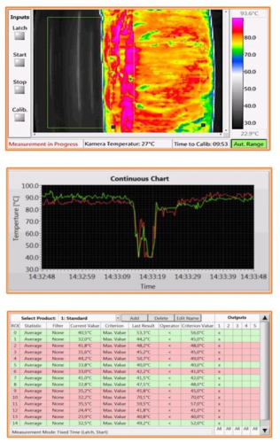 ThermoInspector 系统包含一个中央处理单元,同时可支持多达 4 台热像仪。 所有热像仪均采用高灵敏度(优于 0.03℃)红外热传感器,温度测量范围可达﹢2000℃。正由于这些非凡的特性,它可以连续测量和评估被测产品表面的热场,无论是塑料、金属还是生物材料。因此,本系统可以检查热特性,例如热梯度,最高或最低温度,以及评估温度沿热断面的分散情况,检查所选区域中温度上升的速度。