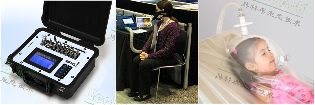 图左为新款FMS便携式主机,图中、右为人体呼吸面罩(或头盔)