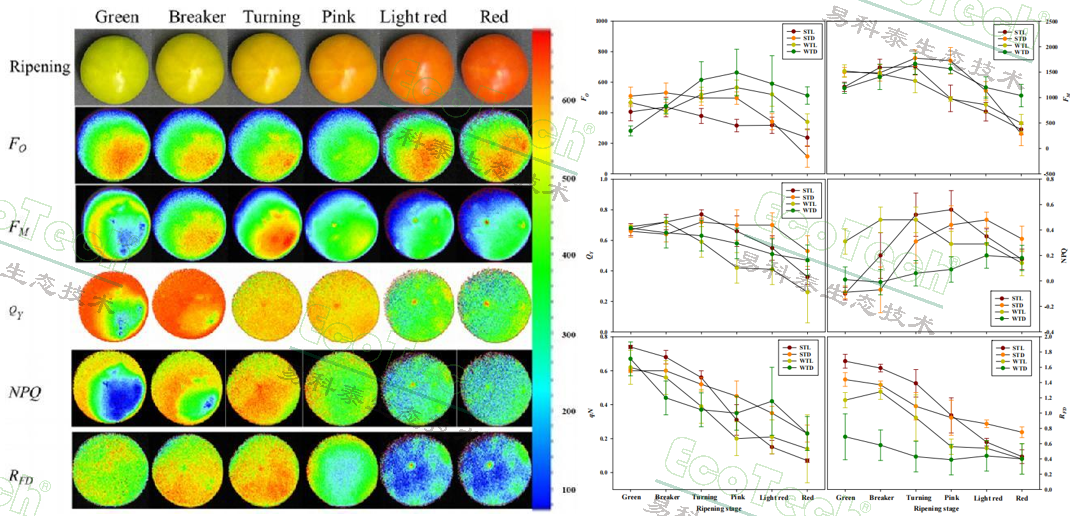 左图,不同成熟度番茄叶绿素荧光成像图;右图,不同温度、光照条件下番茄不同成熟度的荧光参数值