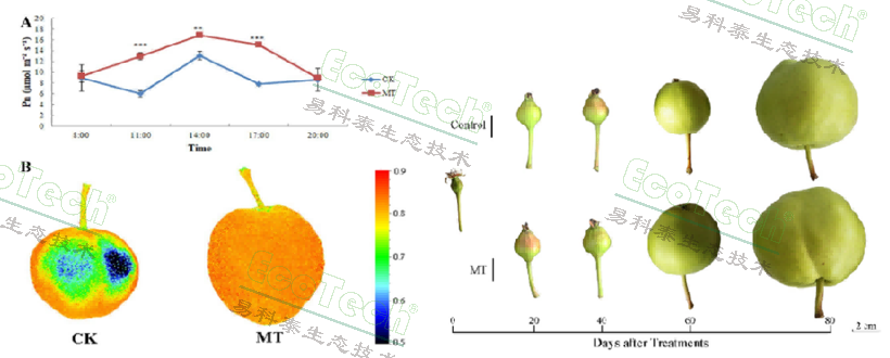 西北农林科技大学的研究者们利用FluorCam叶绿素荧光成像,针对褪黑素对早酥梨果实生理特性的影响进行了探究(Jianlong Liu,2019)。结果表明,在果实膨大阶段,褪黑素(MT)处理过的水果中最大光量子产量(Fv/Fm)保持在0.82左右,未处理过的水果(CK)中为0.73,褪黑素增强了梨果实的光合能力,提高了单果重量。