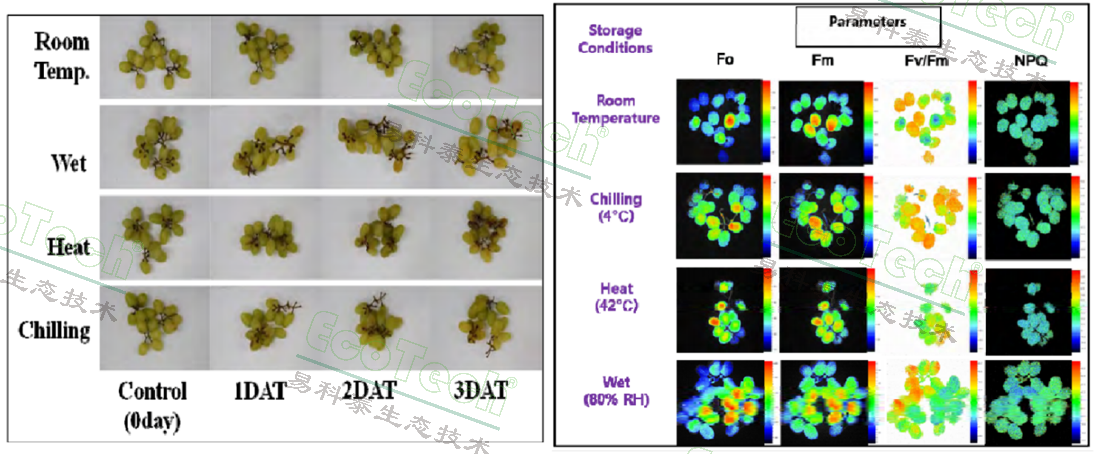 利用FluorCam叶绿素荧光成像鉴定葡萄果实新鲜度(YOO, 2015)。新鲜葡萄分别置于室温、加湿、高温、寒冷的环境下存储,一定时间后分别检测样品葡萄光合状态的变化。结果显示,葡萄果实中Fv / Fm、ΦPSII和NPQ的数值变化在热条件下高于其他条件。低温(4°C)和潮湿条件可保持Fv / Fm值在0.8作用,生理状态相对更加稳定,可作为绿色葡萄果实的合适存储方法。