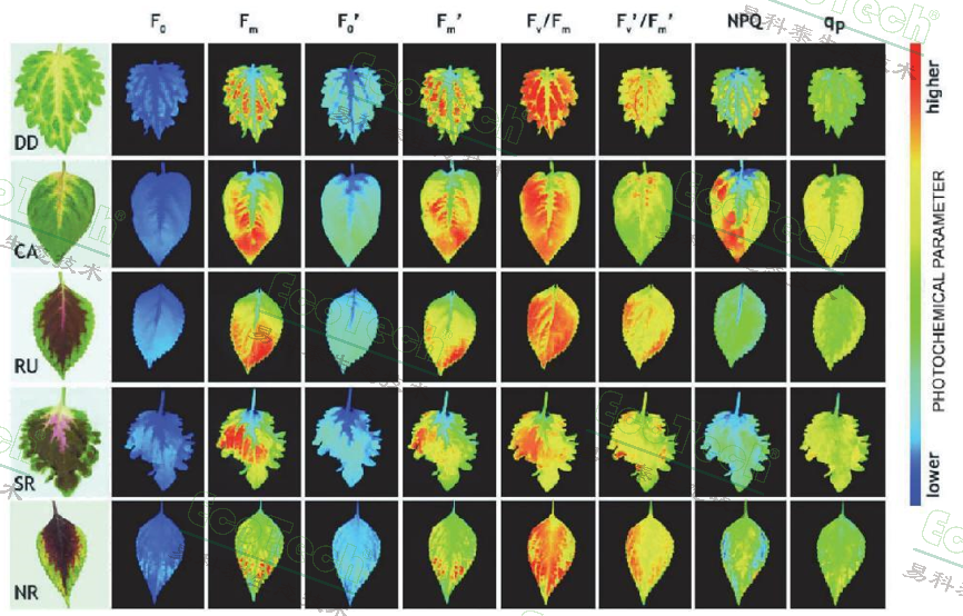 研究发现,叶片不同色素区域及不同品种间存在显著差异:虽然紫色部分的叶绿素浓度高于绿色部分,但F0,Fm,F0’和Fm’均略低于绿色区域,这表明花青素和类胡萝卜素在红色区域中含量较高,具有光保护作用。