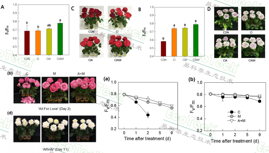 除了观赏植物育种、胁迫方面的研究,叶绿素荧光成像还可应用于花卉采后保鲜等领用,用于评估鲜切花质量、保鲜技术等。鲜切花尤其是鲜切月季在采摘运输过程中,保鲜处理也是非常重要的,而鲜花的保鲜技术与水果蔬菜又有很大不同。韩国世宗大学在相关研究中,对不同品种的月季施加了各种防腐液与乙烯抑制剂,以评估最佳的保鲜运输方法。FluorCam叶绿素荧光技术为鲜花活力评估鉴定提供了最有力的证据。