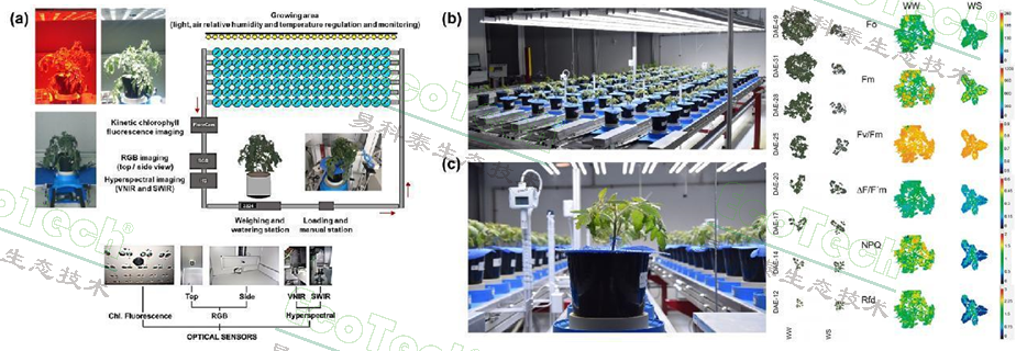 植物表型组学是通过表型分析系统,在不利条件下筛选理想农业性状,研究植物发育、生理活性、健康状态的学科。该方法采用综合技术手段,能动态评估植物的应激反应,具备高时间分辨率优势。借助集成式高通量植物表型分析平台,结合成像传感器、机器人技术和计算机视觉技术,可实现对多种植物性状的动态无损检测。通过筛选生长速率、光合活性和耐温性等表型特征来评估植物在非生物胁迫下的表现,对于筛选抗逆性优良品种至关重要。