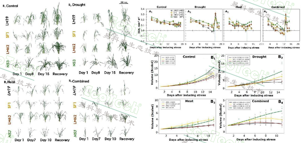 本研究中,根据热敏感性筛选出四个基因型(热敏感型:LM19、SF1;热耐受型:LM62、NS3)。研究人员对分蘖期小麦植株实施四种胁迫处理:对照组、干旱胁迫、高温胁迫及干旱与高温联合作用。干旱处理16天,高温与复合胁迫均处理11天,之后3天恢复期。通过PlantScreen表型分析系统RGB,对植物在胁迫早期、晚期及恢复期的形态生理特征进行了量化评估。