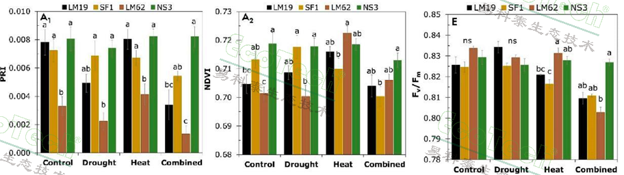 叶绿素荧光成像结果表明,LM19和LM62基因型对后期干旱胁迫更为敏感;热敏感基因型对于后期热胁迫耐受性极低;NS3在复合胁迫下仍保持较高的光系统II效率,在单一胁迫阶段也表现较强的光合和恢复能力。Fv/Fm在干旱胁迫下无显著差异,可能是胁迫程度不够,这与以往干旱研究结论相符