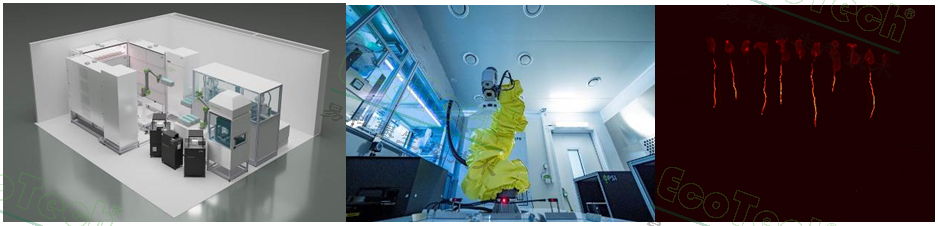 “冥王”(Hades)系统则为一套PlantScreen高通量琼脂培养植物表型成像分析系统。这是一套专门为琼脂平板培养植物进行自动接种、培养与表型成像分析的系统。该系统为全自动机器人操作,包括倾倒琼脂、播种、层积催芽、接种、成像分析全自动运行。可容纳2160个特制培养皿的全自动全流程高通量表型分析。系统由具备GMO(转基因生物)控制区的环控室、操作台、培养柜(包括层积催芽柜)、机器人及成像工作站等组成,可进行根系形态成像分析、GFP等荧光蛋白成像分析、叶绿素荧光成像分析、多光谱成像分析、高光谱成像(透射光)分析及香豆素荧光高光谱成像分析等