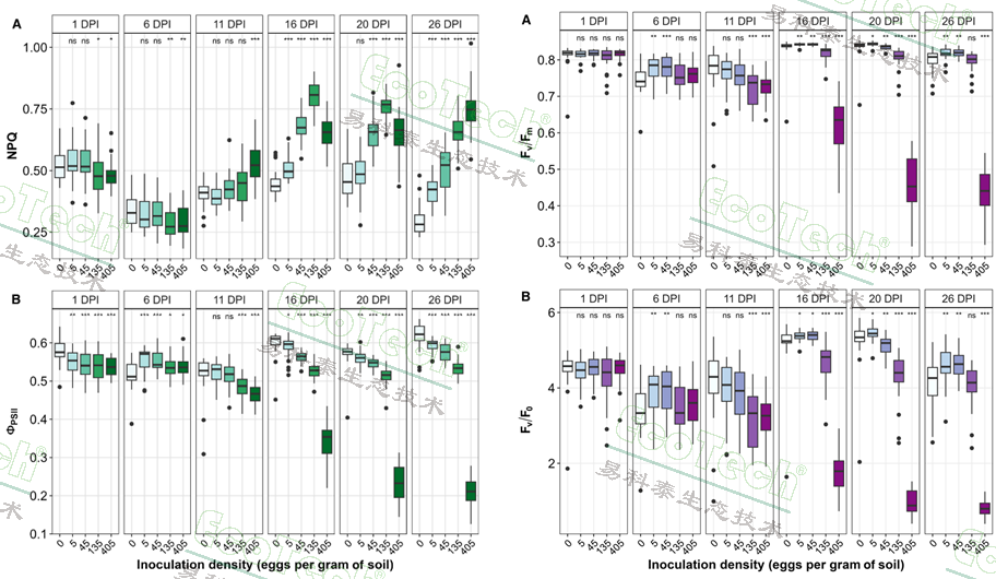 2)高灵敏度: ΦPSII是对低水平侵染最敏感的指标。即使在最低接种密度(5卵/克土)下,从第1天起就能检测到其下降。而NPQ则在第1天对高接种密度表现出响应。