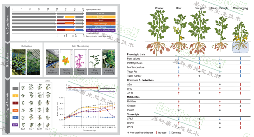 随着气候变化加剧,热浪、洪涝和干旱等极端天气事件频发,严重威胁作物生产。马铃薯作为全球重要的粮食作物,其生长和产量极易受到不良环境条件的影响。本研究旨在对马铃薯(栽培种 'Désirée')应对单一及复合非生物胁迫(高温、干旱、涝渍)进行综合性分析,通过整合高通量表型分析和多组学数据,深入理解马铃薯在模拟未来现实气候情景下的胁迫响应机制,并建立了一个生物信息学分析流程来整合这些复杂数据。这项研究由包括荷兰瓦赫宁根大学和乌得勒支大学在内的多家欧洲学术与科研单位参与,是欧盟ADAPT马铃薯育种项目的重要研究成果之一。
