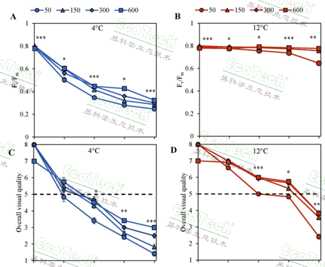 利用FluorCam叶绿素荧光成像系统测量后发现,罗勒叶片最大光化学效率Fv/Fm在4°C贮藏下显著下降,但EOP光强对其无显著影响。Fv/Fm反映了植物光合反应中心在胁迫条件下的损伤程度,是目前衡量植物受胁迫程度与抗性高低最灵敏的指标之一。因此,结果表明,EOP高光可有效提升罗勒的营养价值(碳水化合物、迷迭香酸、抗坏血酸),但未能增强罗勒的耐冷性。