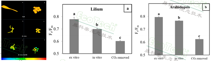 叶绿素荧光成像直观呈现了不同处理下植株光合功能的空间差异,清晰反映出二氧化碳匮乏对光合系统 II 的损伤:体外二氧化碳匮乏条件下,百合组培苗Fv/Fm 从0.69降至0.6,拟南芥从0.76降至 0.62,均出现显著下降,且百合的下降幅度更大。