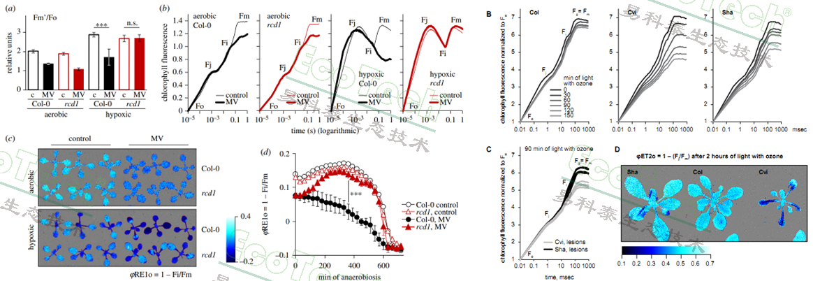 左图:拟南芥rcd1突变体在低氧环境下的OJIP曲线与φRE1o(PSI电子受体的电子流量子产额)成像图与数据(Shapiguzov,2019);右图:拟南芥在臭氧和光照处理后的OJIP曲线与成像图(Morales, 2021)
