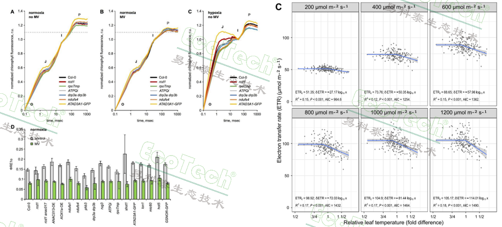左图:拟南芥在正常含氧量环境与缺氧环境下添加或不添加百草枯(MV)的OJIP曲线与φRE1o(PSI电子受体的电子流量子产额)数据图(Punkkinen,2025);右图:蚕豆不同光照条件下相对叶温与电子传递速率ETR的相关性(Shapiguzov,2025)