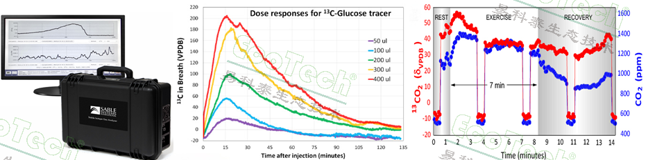 图1 左:动物稳定同位素分析仪;中:不同剂量13C-葡萄糖示踪剂的剂量反应曲线;右:运动状态下13C-棕榈酸标记体脂的氧化动态变化