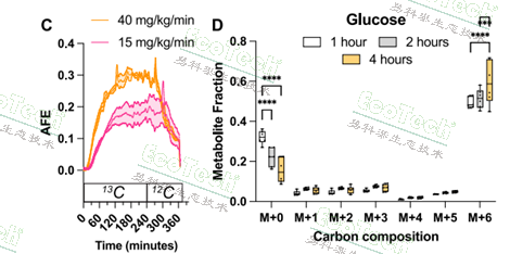 Vanderbilt团队在《Nature Communications》发表了一项研究成果,给清醒小鼠持续静脉输注高vs低剂量[U-¹³C₆]-葡萄糖,他们发现:高剂量组(40mg)60min内13CO2呼出达到平台期,同时抽血测葡萄糖同位素标记,发现80%的葡萄糖分子6个碳全部被13C取代(M+6),把肝脏取出来测糖原,发现其葡萄糖单元里有30–50%是13C标记的,证明从血液里“现成”的13C-葡萄糖直接被肝脏抓去合成糖原,合成速度极快;结合MALDI-MS成像、MIMS-EM等技术,该研究首次把“器官-细胞-细胞器”三级代谢图谱串成一条时间轴。