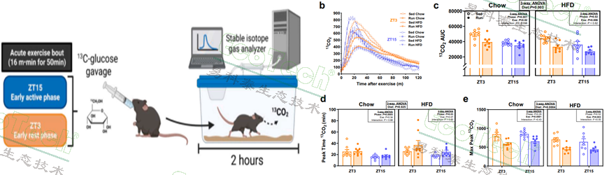 为了探讨运动时间(昼夜节律)对运动后底物代谢的影响,以及肥胖如何改变这种“时间-代谢”可塑性,Karolinska与哥本哈根团队让lean与HFD小鼠分别在静息期(ZT3)或活动期(ZT15)跑台60min,随后灌胃[U-¹³C6]-葡萄糖并连续测¹³CO2呼出。