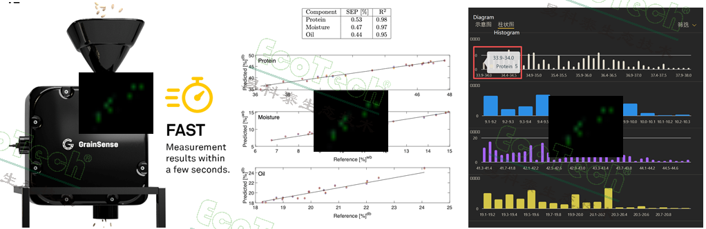 左图:流动式种子成分分析;中图:大豆蛋白质、水分、脂肪含量预测值与真实值对比;右图:实时分析测量并显示频率直方图