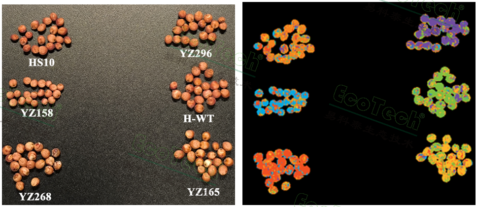 右图:不同种质蓝绿荧光指数图(EcoTech®实验室供图)