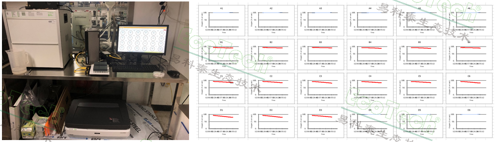 右图:24通道的种子耗氧曲线(蓝色曲线为空白对照,红色曲线为不同处理的测试种子)