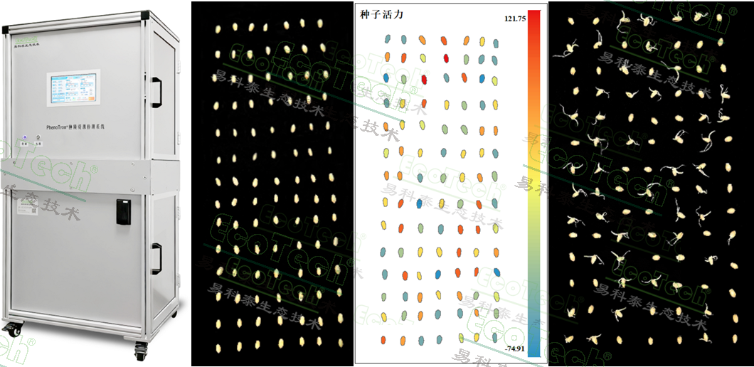 上图自左至右依次为:PhenoTron种质资源检测分析系统;失活处理并混合后的种子RGB图像;种子活力预测图(发芽的概率);种子实际发芽情况(EcoTech®实验室)