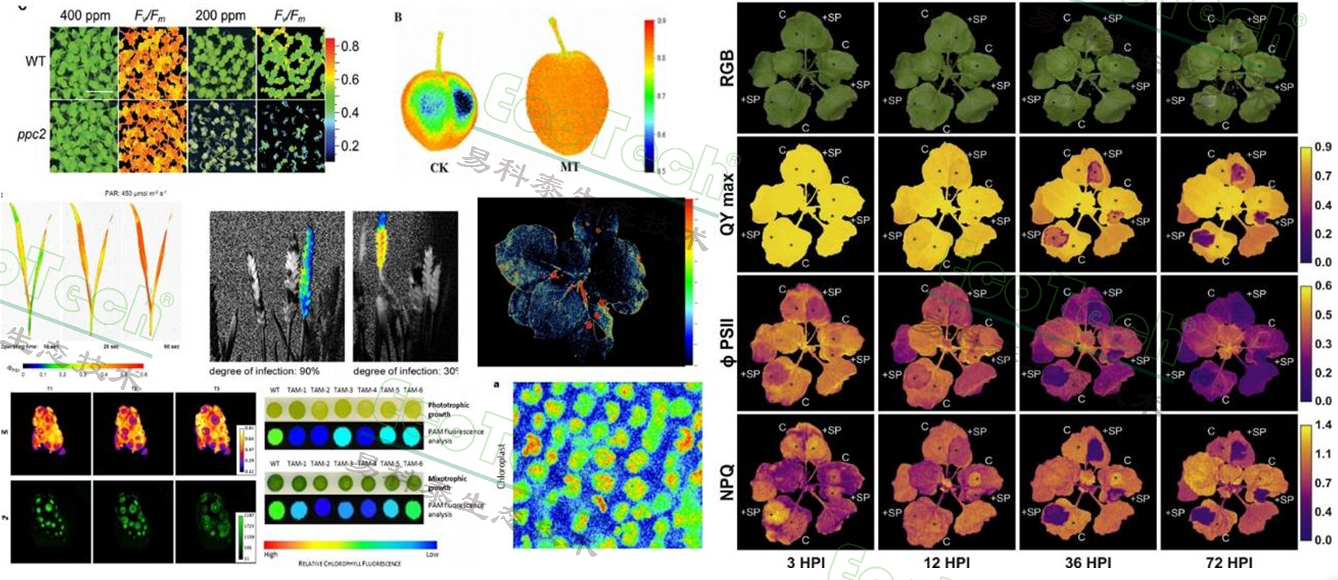 这一技术目前已经广泛用于植物/藻类光合生理与光合功能基因、植物/藻类逆境响应与抗逆功能基因、植物表型组学、突变株筛选、转基因植物功能与表型检测、植物/藻类生理生态等科学研究研究;在农业生产中,则用于优良作物品种选育、作物抗逆性评估、农药/施肥效果与环境友好评估;在环保领域,也用于环境污染与生态毒理评估等。研究对象涵盖拟南芥、烟草等模式植物、作物(包括叶片和麦穗)、水果(包括果实和叶片)、蔬菜、林木、微藻、大型藻和藻类共生体;以及地衣、苔藓等低等植物。