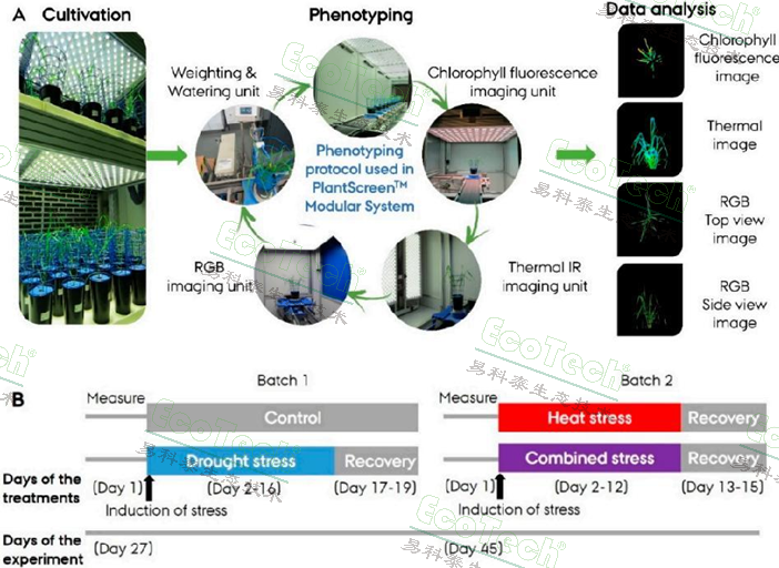 A:本研究中的PlantScreen表型系统工作流程:样品在培养室中生长;在培养称重/浇灌单元控制土壤含水量;在叶绿素荧光(评估光合性能)、热红外(分析蒸腾效率)、RGB(监测植株生长动态)三个成像单元中成像分析,B:样品胁迫处理流程