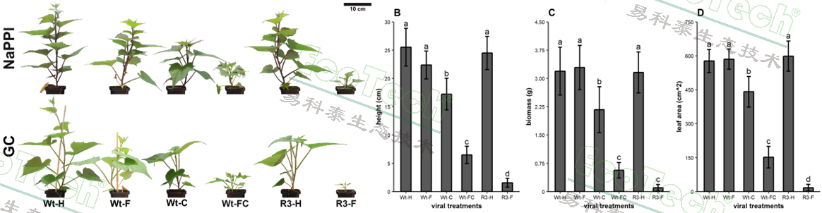 结果表明,与健康植株(Wt-H)和仅感染SPFMV(Wt-F)的植株相比,感染SPCSV(Wt-C)、共感染(Wt-FC)以及转基因感染(R3-F)的植株生长受到显著抑制,表现为株高降低、生物量和叶面积减少。