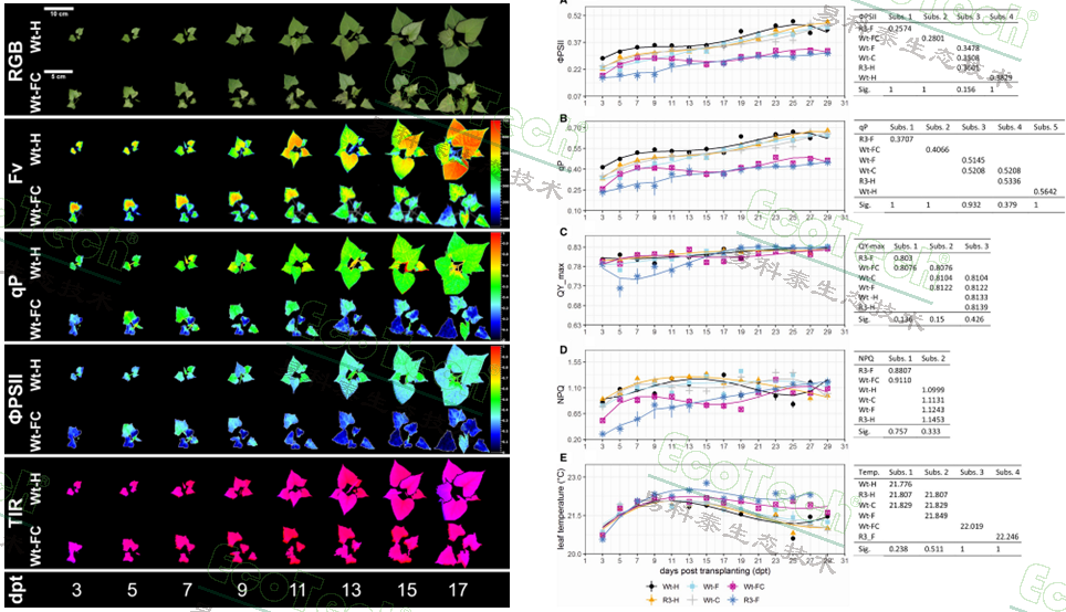 左图:不同生长时期的RGB、叶绿素荧光和热成像图;右图:各项叶绿素荧光参数的动态变化曲线
