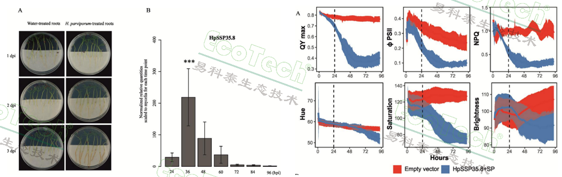 左图:接种病菌的云杉根部和HpSSP35.8的表达动力学;右图:本氏烟叶片的叶绿素荧光与RGB彩色成像参数动态变化,叶绿素荧光参数包括QYmax、ΦPSII和NPQ,RGB彩色成像图转化为色调饱和度数据(Hue-Saturation-Brightness)